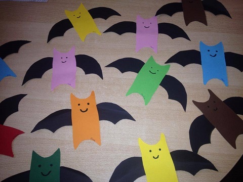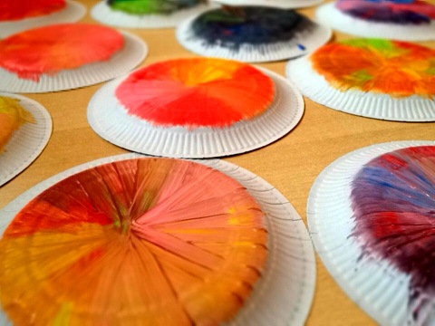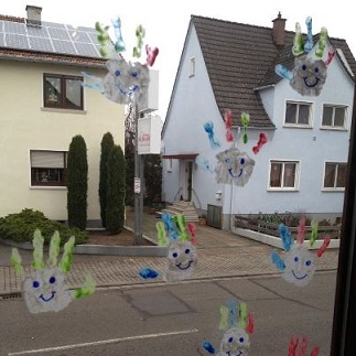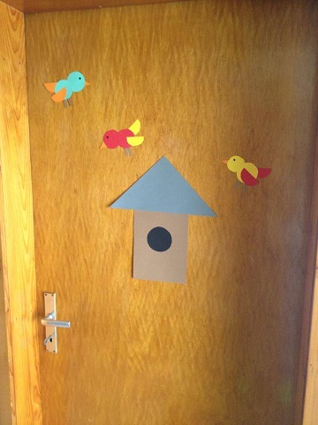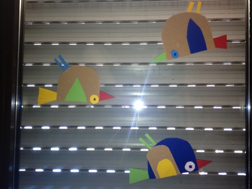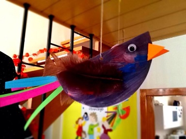 ... aus den angemalten, bunten, runden, Tellern sind tolle Vögel geworden, die jetzt in unserem Eingangsbereich flattern :)