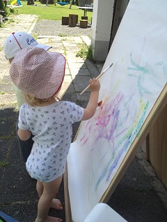 Unsere Staffelei ruhte jetzt eine ganze zeit lang ... Doch heute ist sie endlich aus der Winterversenkung gekommen und wir haben den Nachmittag damit verbracht, draußen im Hof bunte Bilder zu malen. Macht besonders viel Spaß, wenn man beim Pinsel auswaschen im großen Eimer nicht so aufpassen muss - oder man sich gegenseitig anmalen kann :)