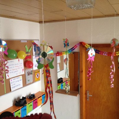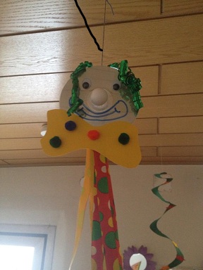 - da waren aber alle Kinder fleissig. Aus alten, ausgedienten CD´s haben wir lustige Clowns gebastelt. Diese zieren nun unseren Eingangsbereich. Helau, Alaaf, Ahoi ...