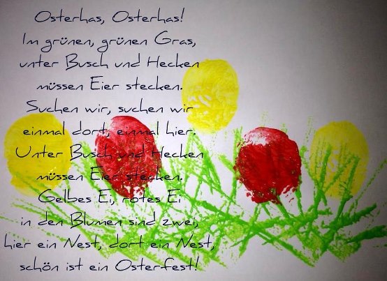 Sonnenblume, Sonnenblume steht an unsrem Gartenzaun (Hand mit gespreizten Fingern als Blume aufstellen) Außen hat sie gelbe Blätter, innen ist sie braun. (mit dem Zeigef. der anderen Hand über die Fingerblätter fahren und innen ist die Handfläche) Kommt ein Vogel angeflogen, Hunger hat er sehr (mit Daumen und Zeigef. einen Vogelschnabel darstellen, der auf und zu geht) Sonnenblume, Sonnenblume gib mir Körner her. Sonnenblume gibt dem Vogel Körner ohne Zahl (Vogel pickt aus der Handfläche der Blumenhand die Körner) Danke Sonnenblume, danke, es war ein gutes Mahl! (Vogel fliegt weg) |